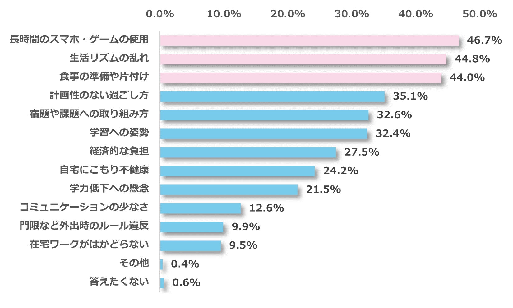 また、夏休み期間中、子どもにストレスを感じていると回答した保護者484名を対象に、ストレスを感じる原因について質問をしたところ、最多回答は「長時間のスマホ・ゲームの使用(46.7%)」、次に「生活リズムの乱れ(44.8%)」、「食事の準備や片付け(44.0%)」と続きました。