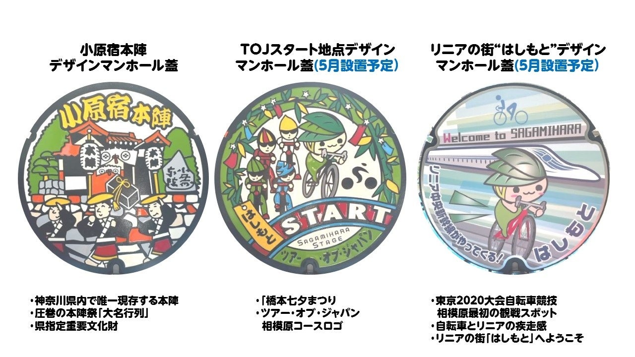 相模原市内の中山間地域の活性化と下水道事業の普及啓発を目的としたこのマンホール蓋プロジェクト。3月19日(日)のアリオ橋本での完成披露会にて9種類のマンホール蓋をお披露目し、同週より順次設置を開始しています。