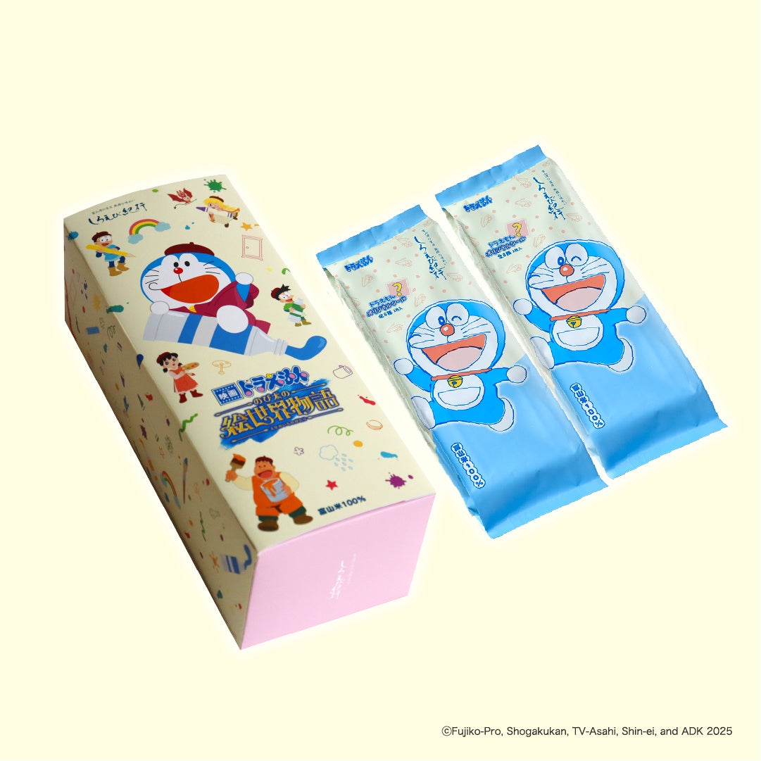 富山県高岡市出身のまんが家 藤子・F・不二雄 氏の代表的なキャラクター『ドラえもん』が2023年に富山銘菓のしろえび紀行パッケージに登場し、話題となりました。今回は『映画ドラえもん のび太の絵世界物語』を記念した限定バージョンを発売します。個包装もかわいいドラえもんの絵柄になっており、全8種のドラえもんのオリジナルシールも付いています。どのデザインが入っているのかは開けてからのお楽しみ。お子様向けのプレゼントにもおすすめです。