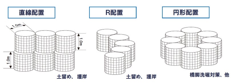現場発生土を有効活用したソイルセメントを円形コンバックの中詰材として使用することで、現場打設式の大型ブロック積擁壁とすることができます。円形コンバックの内袋はソイルセメントの余剰水をスムーズに排水させるため硬化速度を高めます。また、円筒形の金網が型枠として機能するため、地形に応じた柔軟な配置が可能です。
