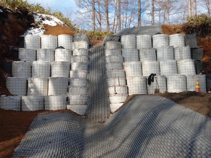 また旭化成アドバンスと小岩金網は、落石・崩土対策や洗掘※4対策などの法面(のりめん)保護に用いる円形コンバック工法を2021年から手掛けており、従来はコンクリートを充填材として利用し、構造体としての強度特性を確保していました。しかし、山間部での施工では、セメント工場から現場までの運搬における制約が課題となっていました。
