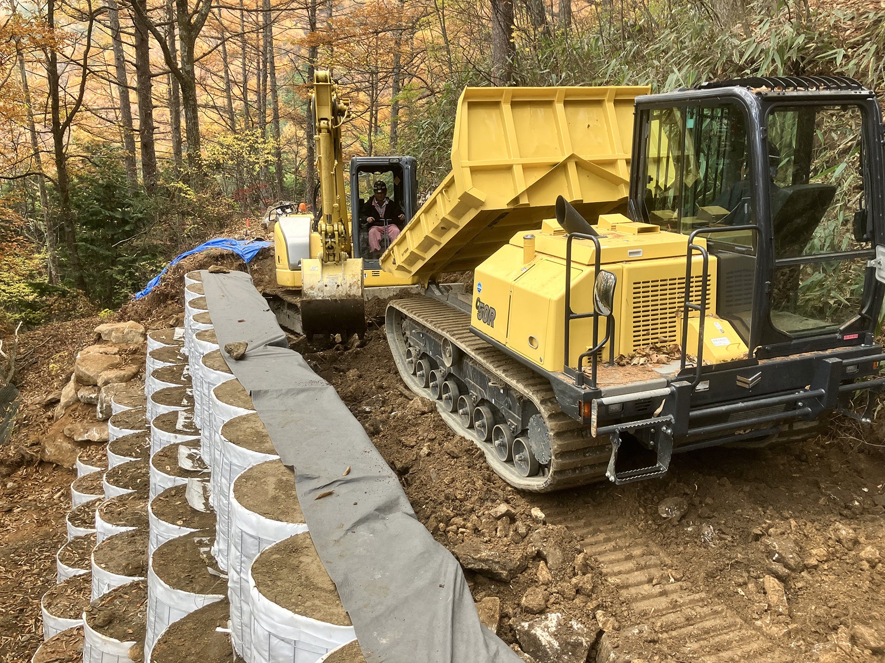 さらに、重量物の運搬が困難な山間部や狭あい地などにおいても、現場発生土を用いることで施工性が向上し、対応力の高い工法となります。類似工法として、大型土のうに現場発生土を充填し積み上げる工法もありますが、袋の耐久性が低いため長期利用に適さず撤去と本設工事が必要となります。一方、円形コンバックは本設資材かつ現場発生土を流用できるため、大型土のう工法における「仮設」「撤去」「本設」の3工程を1工程に短縮でき、さらに、土砂崩落の修繕や豪雨災害の復旧工事では、土砂搬出の時間を軽減することができ、迅速な施工が可能となるため、復旧時間の短縮や二次災害のリスク低減に寄与します。