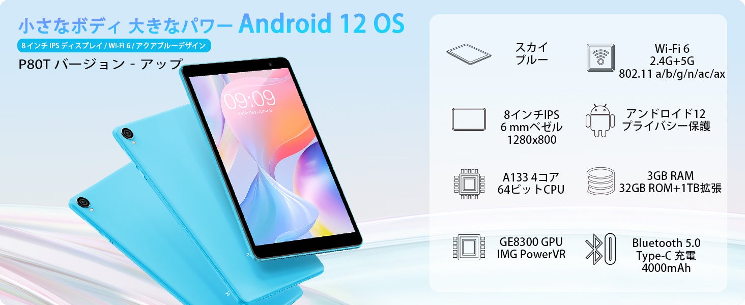 Teclast「P80T」は、8インチのコンパクトさに超薄型の6mmベゼルを設計、簡単に片手で取り扱う可能です。重量はわずか310gで、軽量でポータブルです。鮮やかなアクアブルーデザインを採用し、厳選された色で仕上げて、野外使用時明るくて注目、魅力で個性です。1280×800 HD解像度と16:10ゴールドディスプレイスケールを備えた8インチ広視野角IPSディスプレイは、より優れた映画体験を提供することができます。