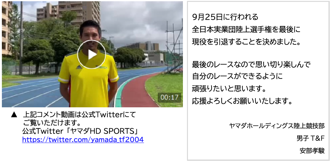 ヤマダホールディングス陸上競技部 男子Track&Field安部孝駿選手 引退に関するお知らせ