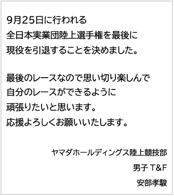 15年以上に渡り競技選手として切磋琢磨してきた安部選手は、第70回全日本実業団対抗陸上競技選手権大会(岐阜県:岐阜メモリアルセンター長良川)の出場をもって現役を引退することとなりました。