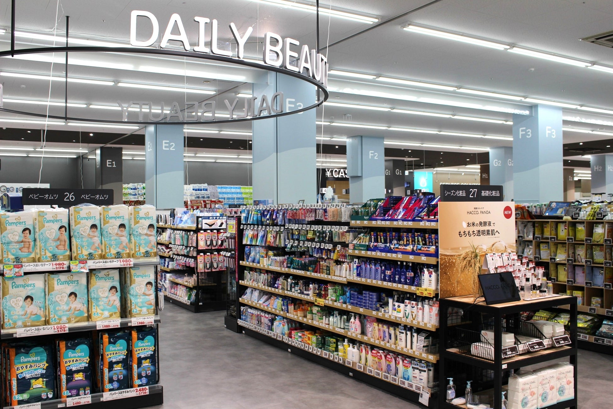 日用品売場では、子育て世代の女性を主なターゲットに「デイリービューティ」コーナーを新設しました。子ども用おむつやスキンケア用品、化粧品など、日常使いのアイテムを取り揃えます。