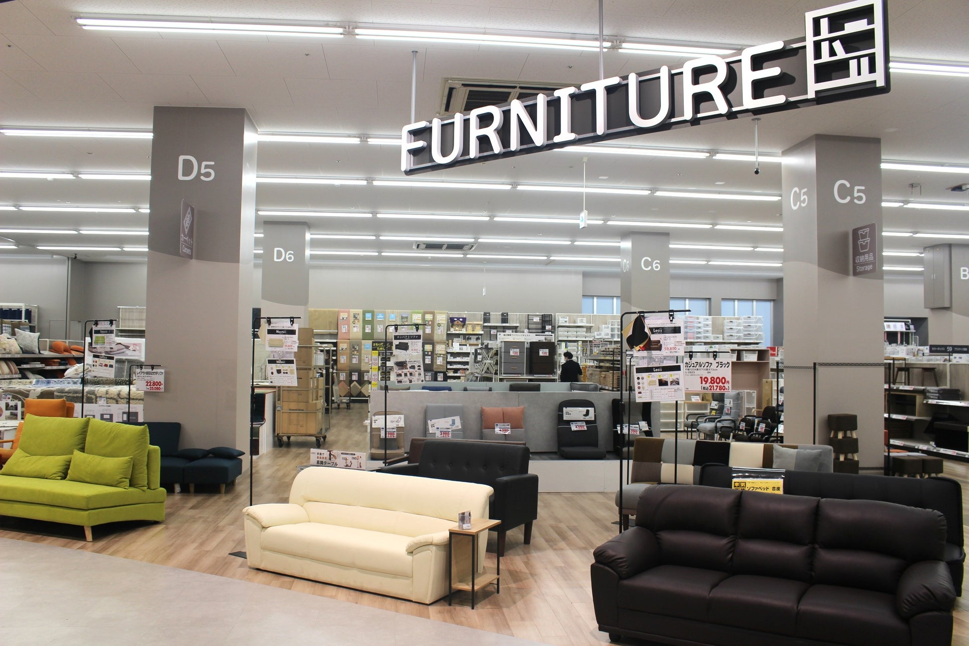 家具売場:ソファや座椅子などの商品の展示スペースを新たに確保し、お客様が実際に座って体験・体感できるよう、売場レイアウトを見直しました。実物に触れながら比較検討いただける環境を整えることで、より納得してお買い物を楽しんでいただけます。