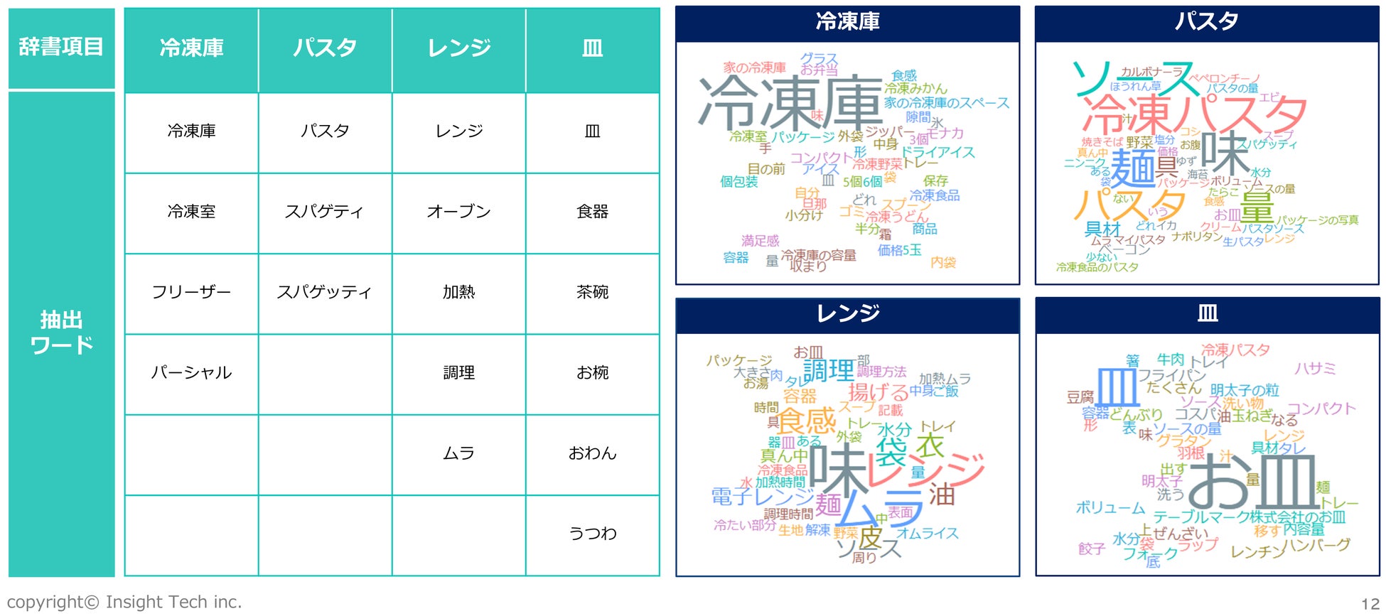 特に未充足割合の高い「冷凍庫」「パスタ」「レンジ」「皿」についてカスタム辞書を作成。「冷凍食品」不満の本文に辞書の対象ワードを含むデータセットを4つ作成した。