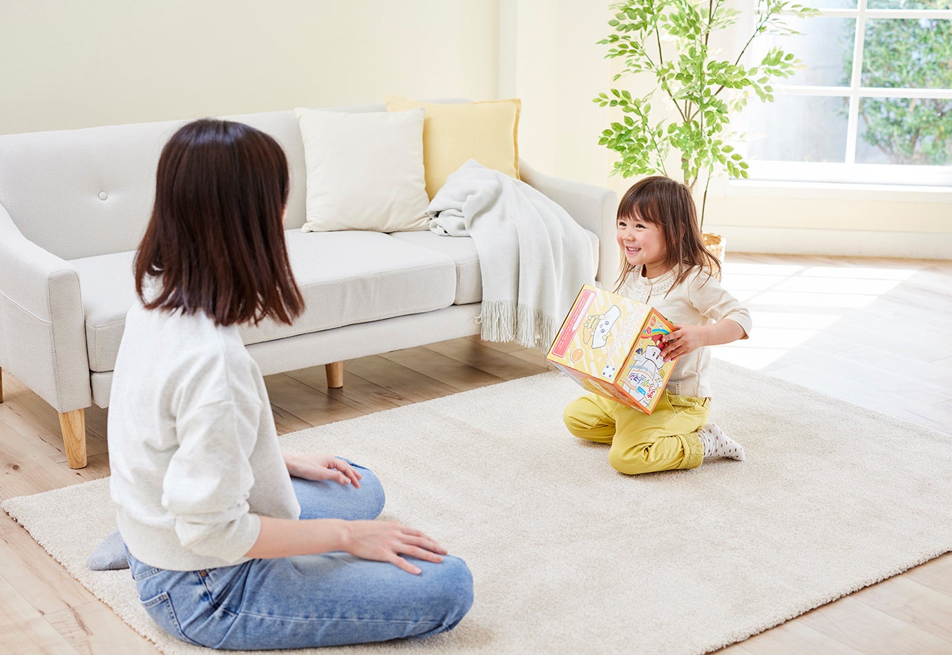 親子で遊ぶ時間を楽しんで欲しいという想いを込め、子育てや孫育てのヒントになるよう、パッケージは小さなお子さまとの遊びに取り入れやすいサイコロ型にしています。数字を覚えたり知育にも役立てていただけるようにしました。