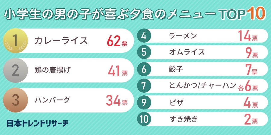 ということで「小学生の男の子が好きな夕食のメニューランキング」は以上の結果になりました。