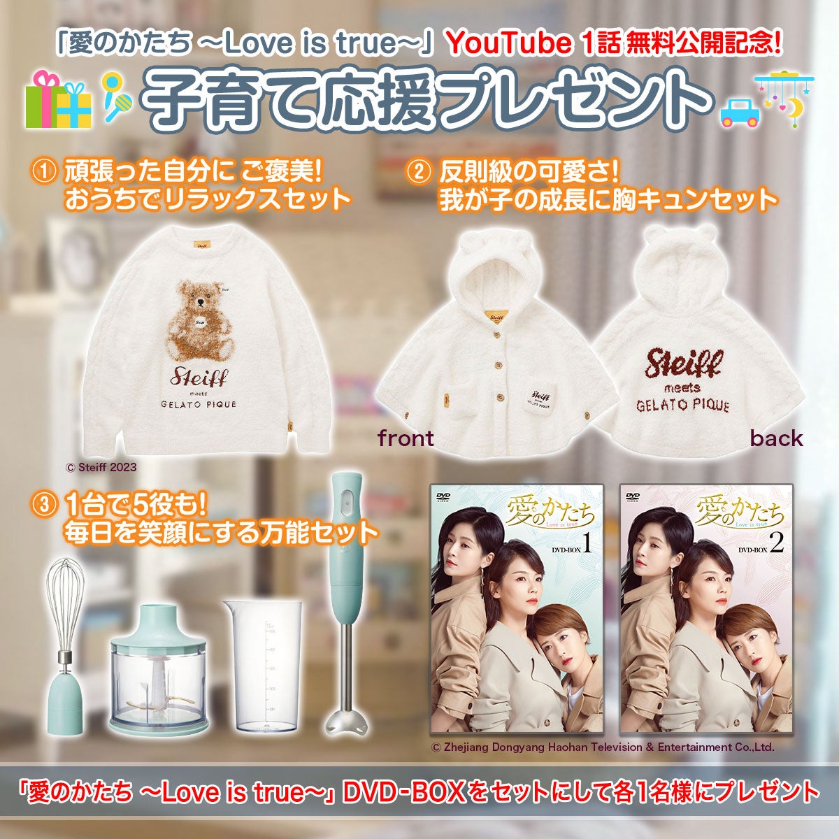 幅広い世代の女性に大人気のルームウエアブランド「ジェラートピケ(gelato pique)」が、世界的人気を誇るドイツのぬいぐるみブランドSteiff(シュタイフ)とコラボしたルームウェア「パウダージャガードプルオーバー」と、テディベアみたいな耳が愛らしい「【BABY】パウダーアランポンチョ」。そして、おしゃれな家電で大人気の「BRUNO (ブルーノ)」からは離乳食をはじめ毎日のお料理に役立つ1台5役のマルチブレンダー「マルチスティックブレンダー」にそれぞれ、キャリア・妊娠・子育てをテーマにした話題作「愛のかたち~Love is true~」のDVD-BOXをセットにした豪華プレゼントが抽選で3名様に当たります。
