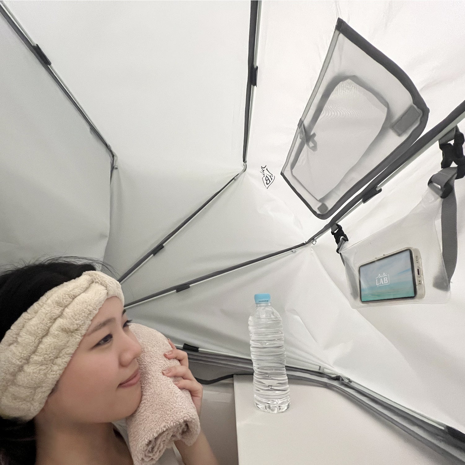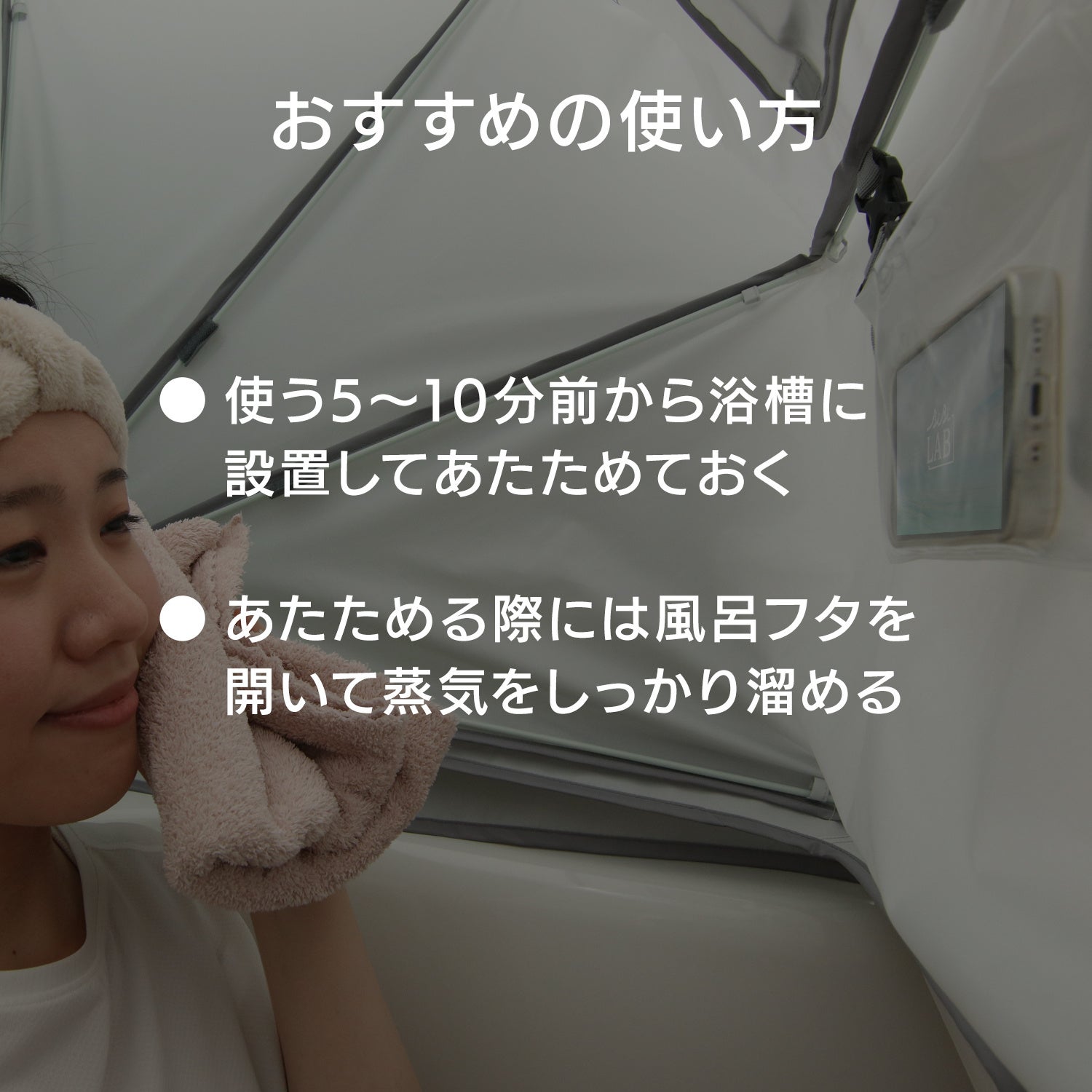 毎日のお風呂時間、どう過ごしていますか?「時間がもったいなくて、ついついシャワーだけで済ませちゃう」「リラックスしたくて湯船にスマホを持ち込んだけど、ずっと手で持ってなきゃいけなくて逆に疲れた...」という経験がある人も多いのではないでしょうか。忙しい日こそしっかりと汗を流して、タイパよくバスタイムを楽しみたい―「おうちサウナテント」は、そんな願いを叶えるこだわりの詰まったお風呂用テントです。