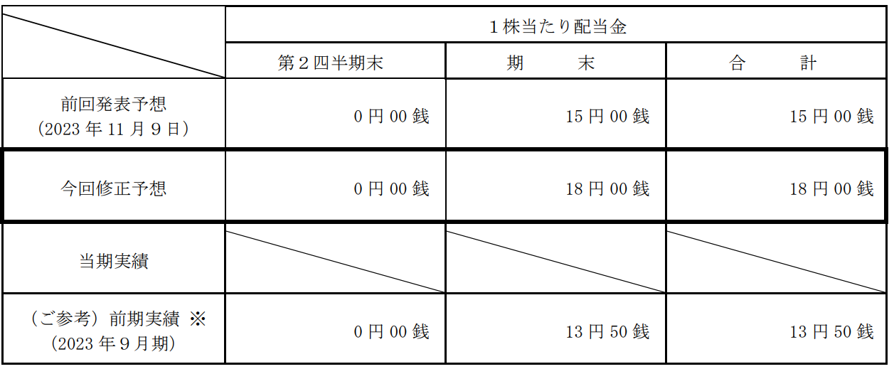当社は、本日開催の取締役会において、以下のとおり、2023年11月9日に開示した2024年9月期(2023年10月1日~2024年9月30日)の配当予想を修正することといたしましたので、お知らせいたします。