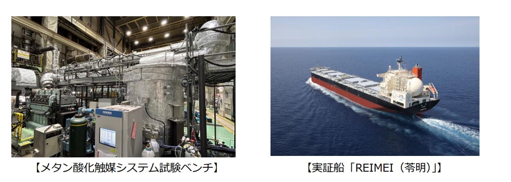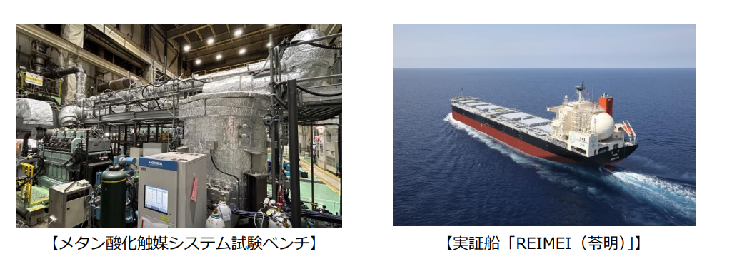 日立造船とヤンマーPT は、LNG を燃料とする舶用エンジンから排出されるメタンを酸化させることでメタンスリップを削減する「メタン酸化触媒システム※2」を 2022 年に開発し、世界で初めて「基本設計承認(Approval in Principle)※3」を NK より取得しました。2023 年 12 月に行った陸上試験では、EGR※4 を用いたエンジン改良とメタン酸化触媒システムを組み合わせること で目標である 70%以上を大幅に上回る削減率 93.8%を達成し、NK より鑑定書を世界で初めて取得しました。この結果が高く評価され、NEDO による 2024 年 2 月の継続支援対象選定審査を通 過しました。今後、2024 年秋頃から商船三井が運航する大型石炭専用船(船名:REIMEI(苓明)) で実海域での実証試験を開始します。