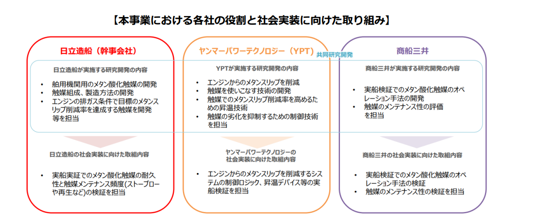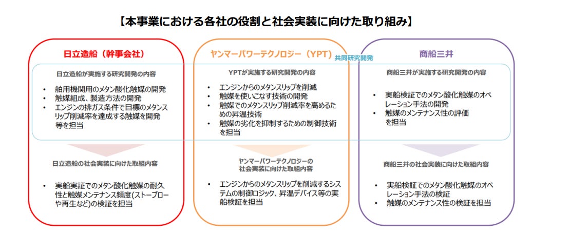 日立造船、商船三井、ヤンマーPT は、本事業を通じて早期にメタンスリップ削減技術を確立させ、国際海運分野における温室効果ガスの排出削減に積極的に貢献していきます。