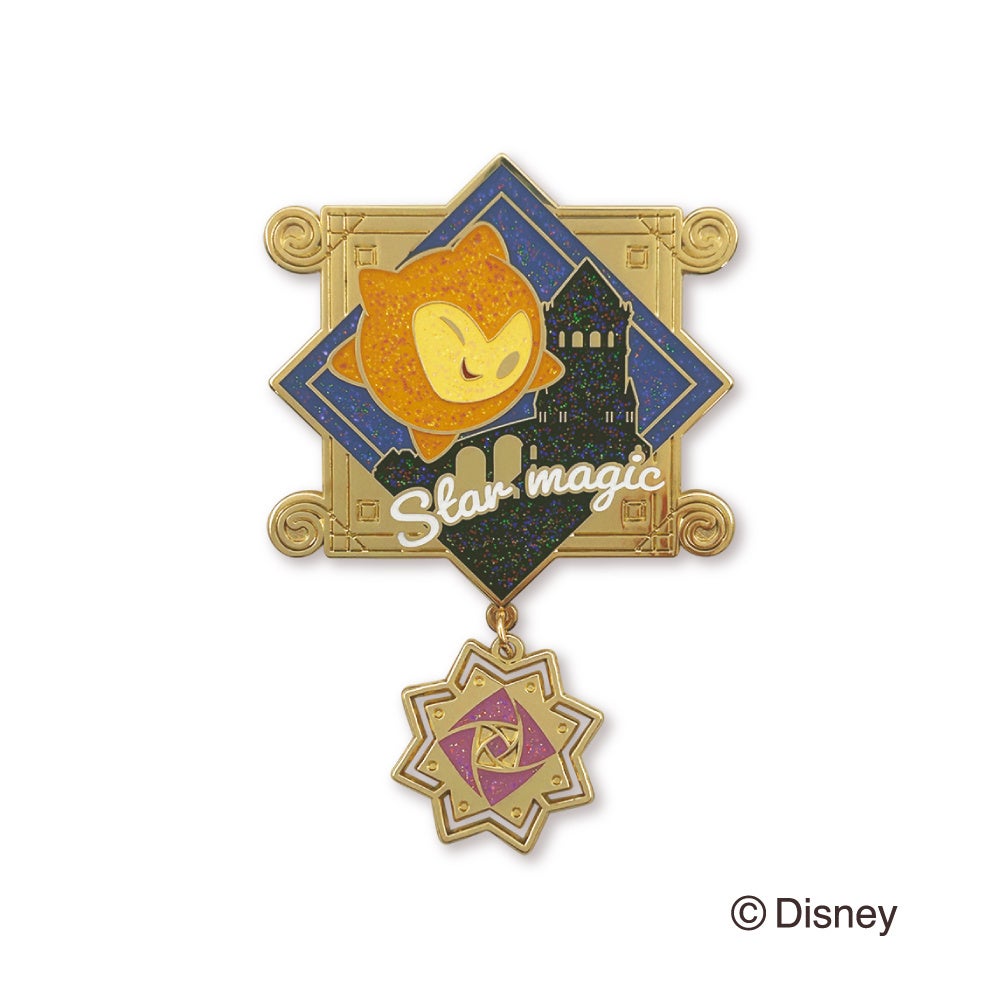 2023年公開の映画『ウィッシュ』の舞台になったロサス王国のお城を背景に、いたずらな願い星「スター」が大きくデザインされたピンバッジ。王国の紋章が揺れるチャームになっています。