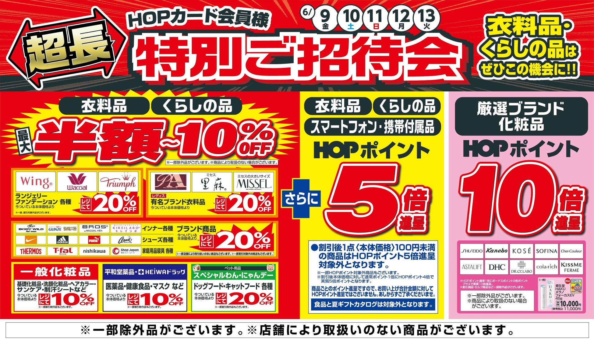 衣料品とくらしの品は、この5日間、最大半額から10%割引、また、均一価格やレジにて割引企画のほか、お買い上げ時のHOPポイント5倍進呈いたします。