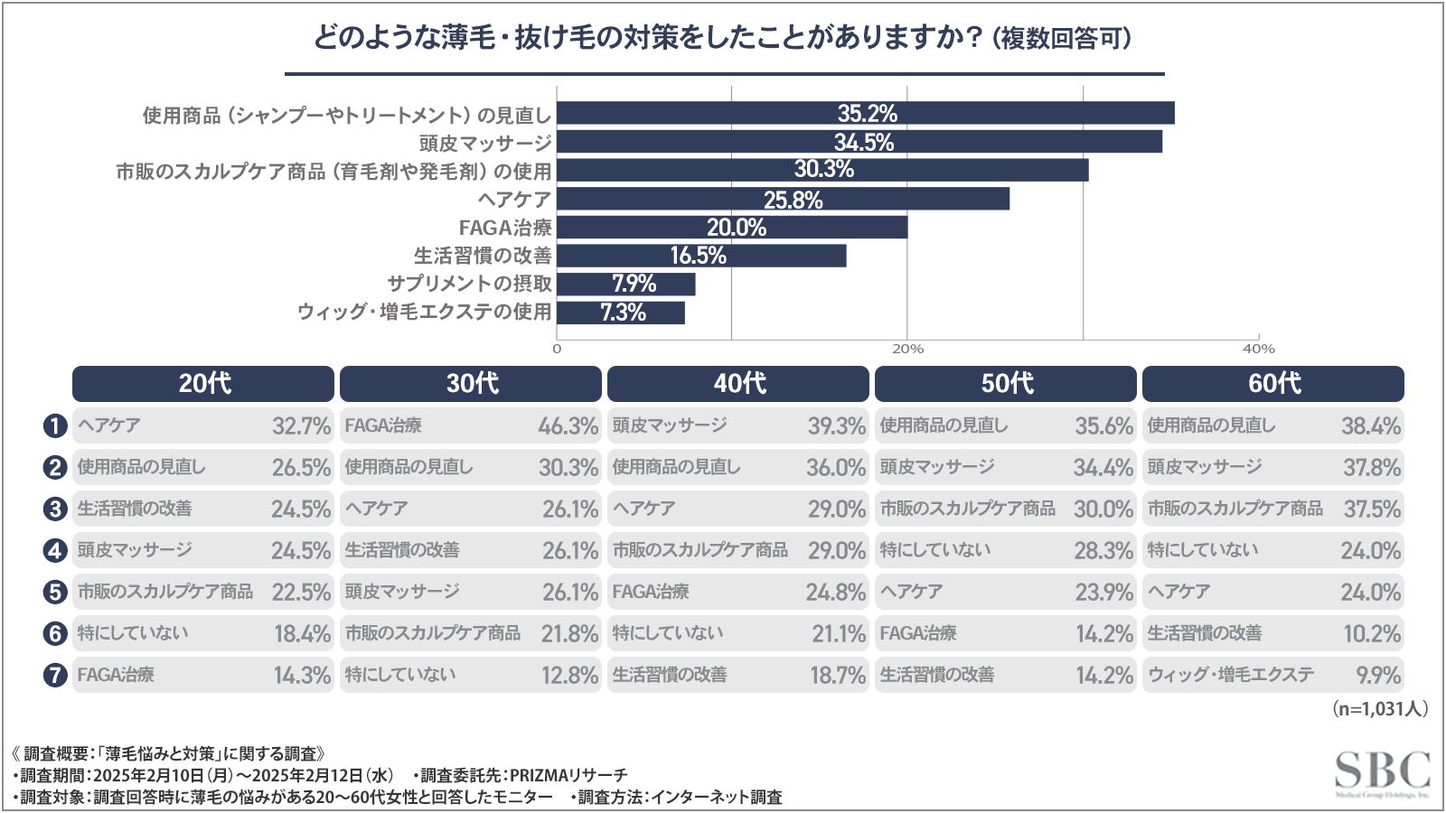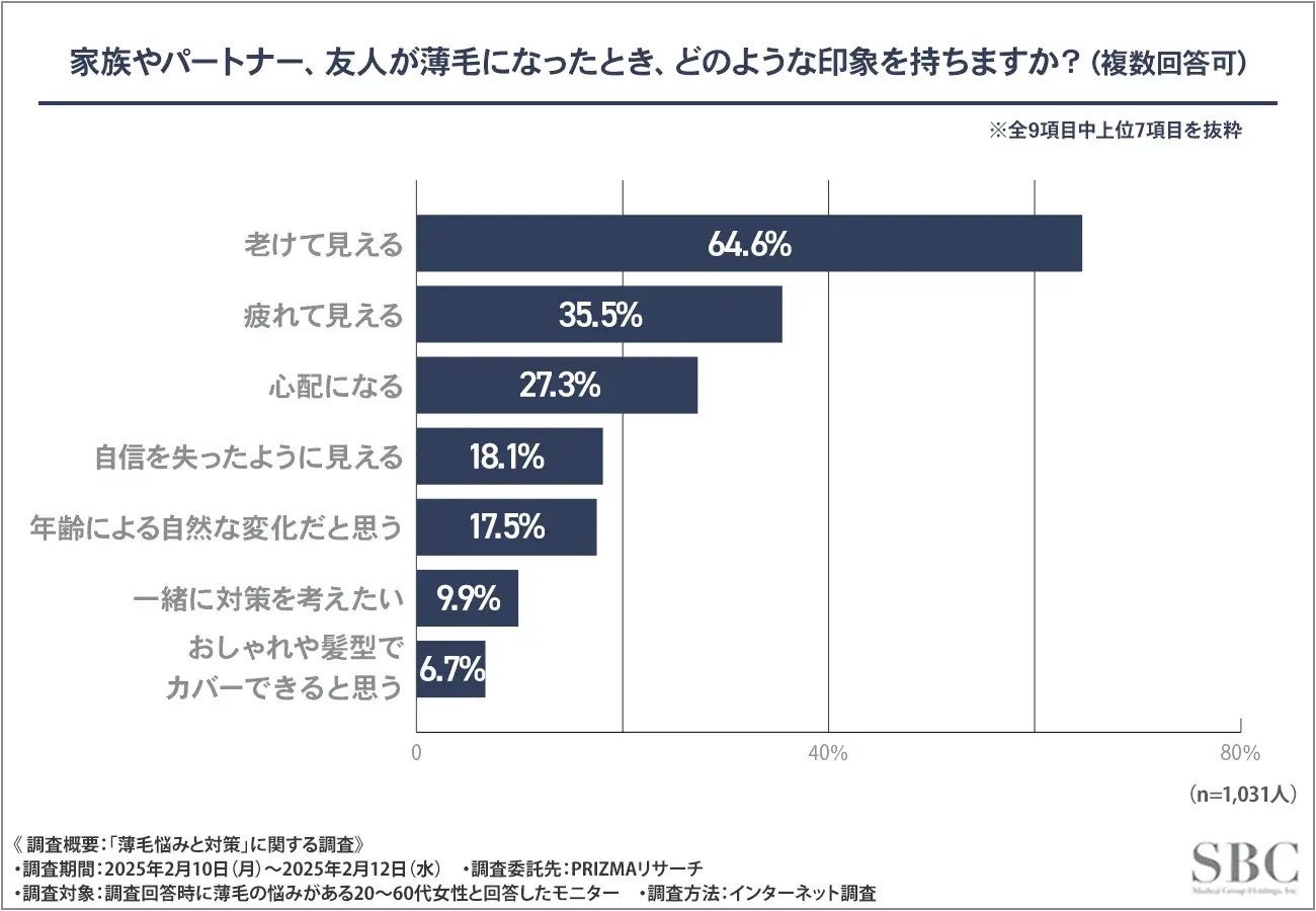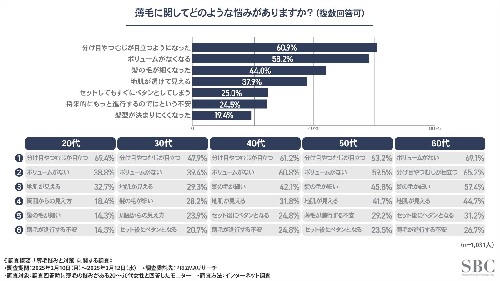 SBCメディカルグループホールディングス(米国カリフォルニア州、CEO:相川佳之、以下SBC)が経営支援を行う「湘南AGAクリニック」は、薄毛の悩みを抱える20~60代の女性1,031名を対象に、「薄毛悩みと対策」に関するアンケート調査を実施しました。本調査では、女性の薄毛に関する悩みの実態や、日常生活への影響、実践しているケア方法、そして最新治療に対する意識について深掘りしています。