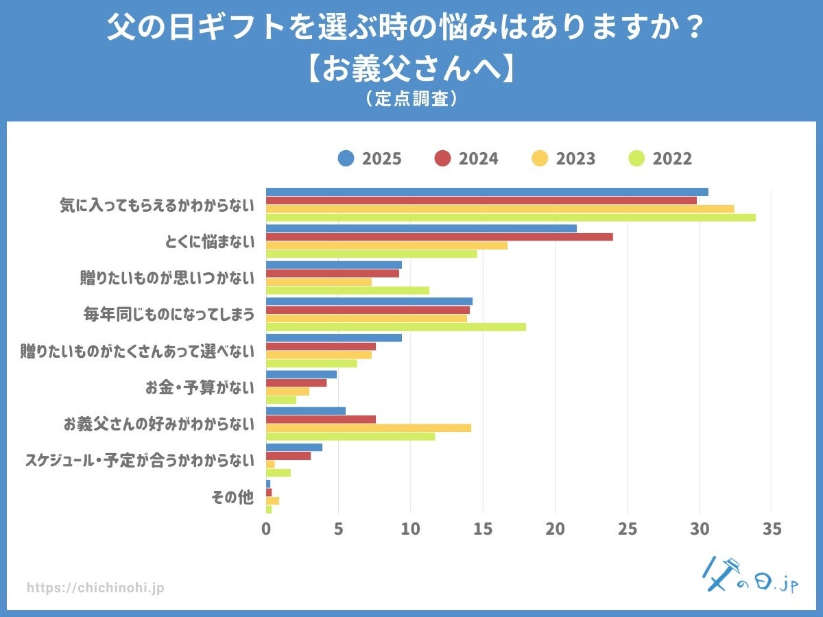 父の日ギフトを選ぶうえで最も多く挙げられた悩みは、「気に入ってもらえるかわからない」という不安でした。2025年の調査では22.7%がこの項目を選択し、全体の中で最も高い割合を占めました。さらに、贈る相手が義父の場合は30.6%と、実父に比べて一段と高い水準に。義父へのギフト選びでは「失礼のないものを選びたい」「本当に喜んでもらえるか自信がない」といった慎重な姿勢が色濃く表れています。