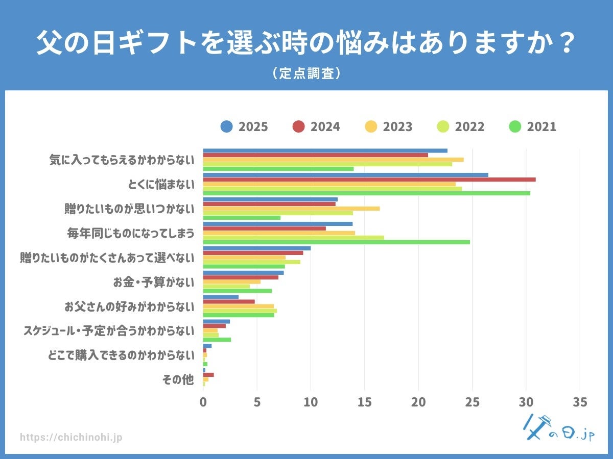 【父の日調査】父の日ギフトを選ぶ時の悩みはありますか?父の日ギフトの情報メディア「父の日.jp」の統計アンケート調査2025年版を発表。過去4年の定点調査も。