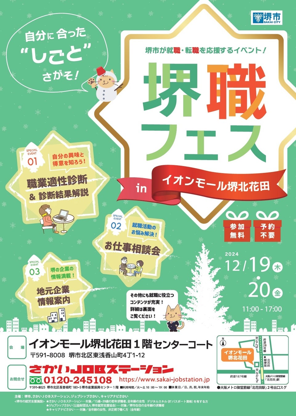 堺市では、地域の雇用促進を図るため、さかいJOBステーション主催の「堺職フェスinイオンモール堺北花田」を開催します。
