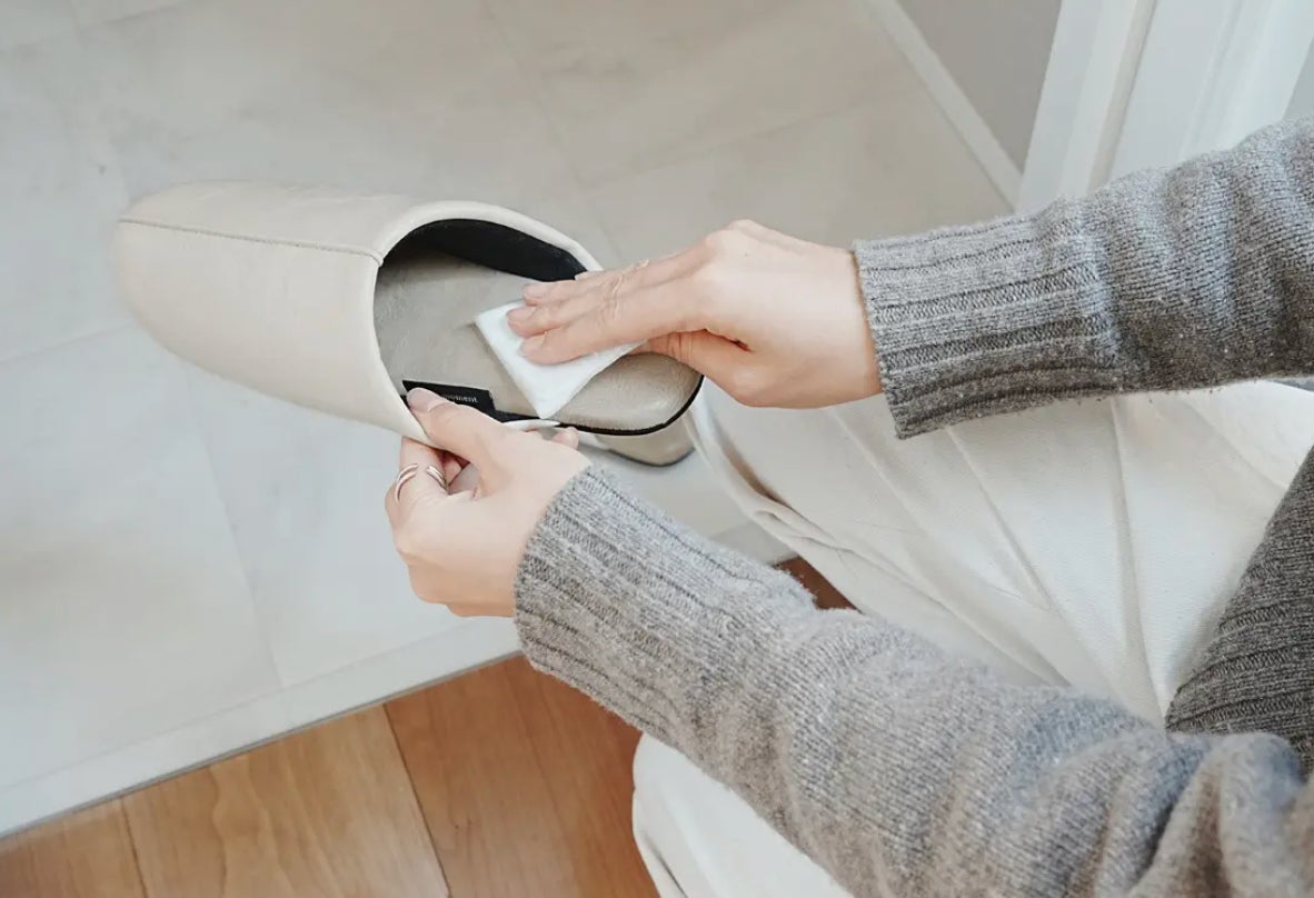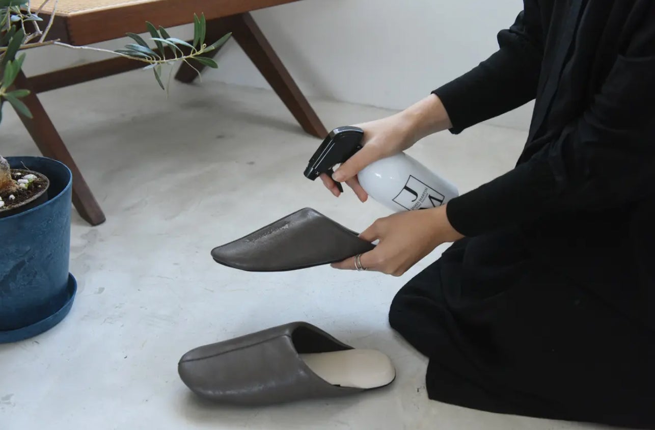 高級感のあるレザー調素材でありながら、気軽にシュッとスプレー&拭き取りができて、いつもキレイに保てるのが嬉しいスリッパです。