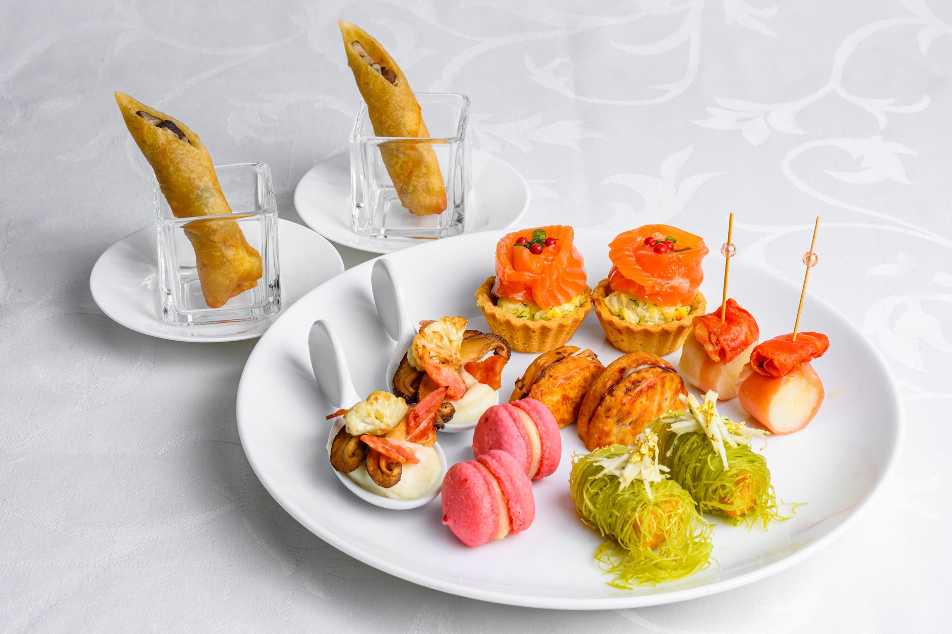 セイボリー 全7種:丸芋サラダとサーモンマリネタルト、エルサレムアーティーチョークの生ハム巻きとセミドライトマトのピンチョス、レンズ豆のテリーヌカダイフ巻と根セロリのサラダ添え、酒粕クリームチーズのビーツマカロン、カリフラワーのムース・クリスベーコンと石川県産椎茸のロースト、生ハムとクリームチーズのドライフルーツスコーン、治部煮スティック