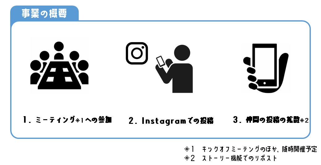 主な活動は、「1.ミーティングへの参加」、「2.Instagramでの投稿」、「3.仲間の投稿の拡散」 となります。