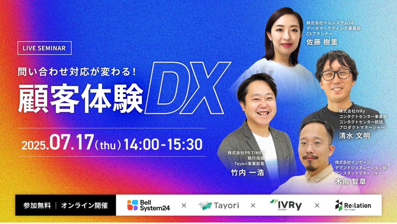 株式会社ベルシステム24(本社:東京都港区、代表取締役 社長執行役員:梶原 浩、以下:当社)は、株式会社インゲージ(本社:大阪府大阪市、代表取締役社長:和田 哲也)、株式会社PR TIMES(本社:東京都港区、代表取締役:山口 拓己)、株式会社IVRy(本社:東京都港区、代表取締役 / CEO:奥西 亮賀)と共同で、「問い合わせ対応が変わる!顧客体験DX」と題したオンラインセミナーを、7月17日(木)に開催します。