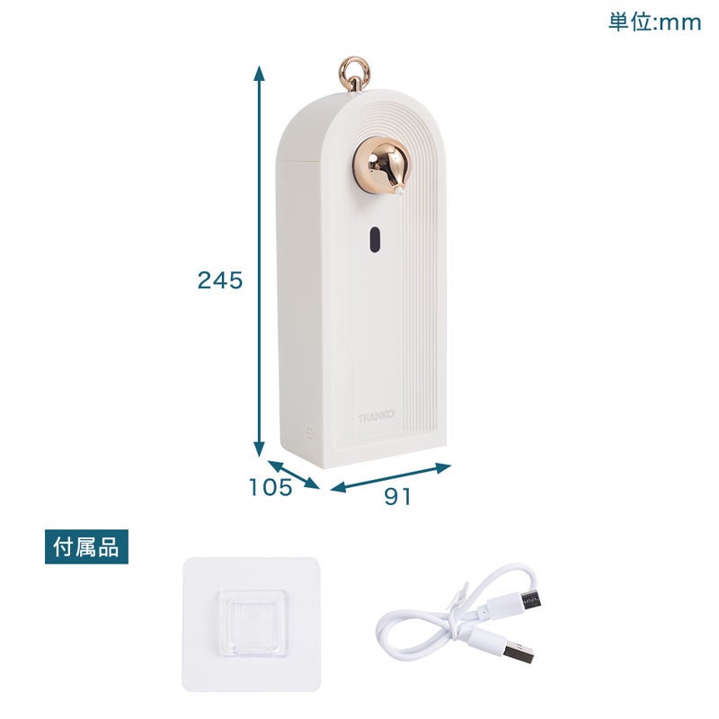 幅91×奥行105×高さ245mm。USB充電式。水を入れるタンク(200ml)とお手持ちの洗顔料などを入れるタンク(120ml)の2つのタンクからなり、本体の前に手をかざすと自動で水と洗顔料を混ぜ合わせてクリーミーな泡を作り出します。