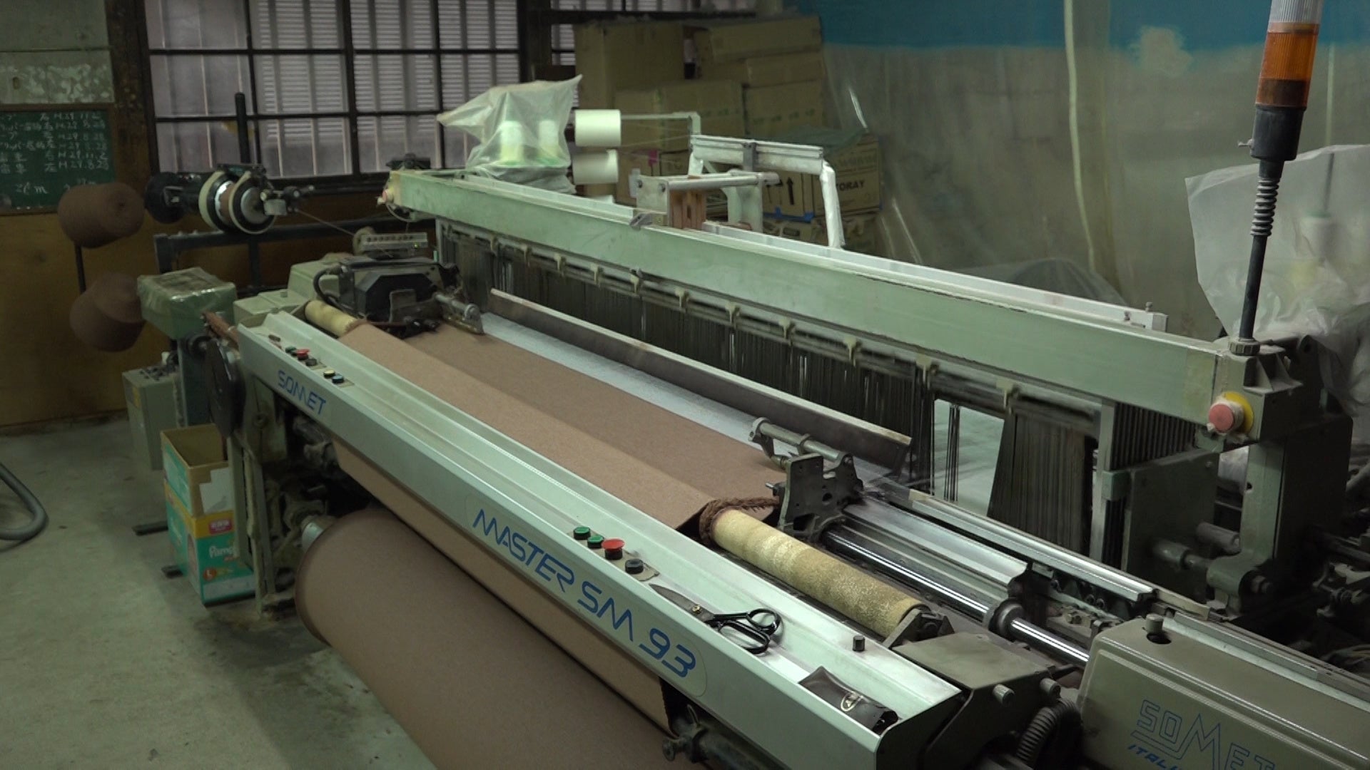・専用機械で撚りをかけて糸に仕上げます。この糸を紡織機で織り上げて反物にし、表面を起毛させ毛先を揃えます。