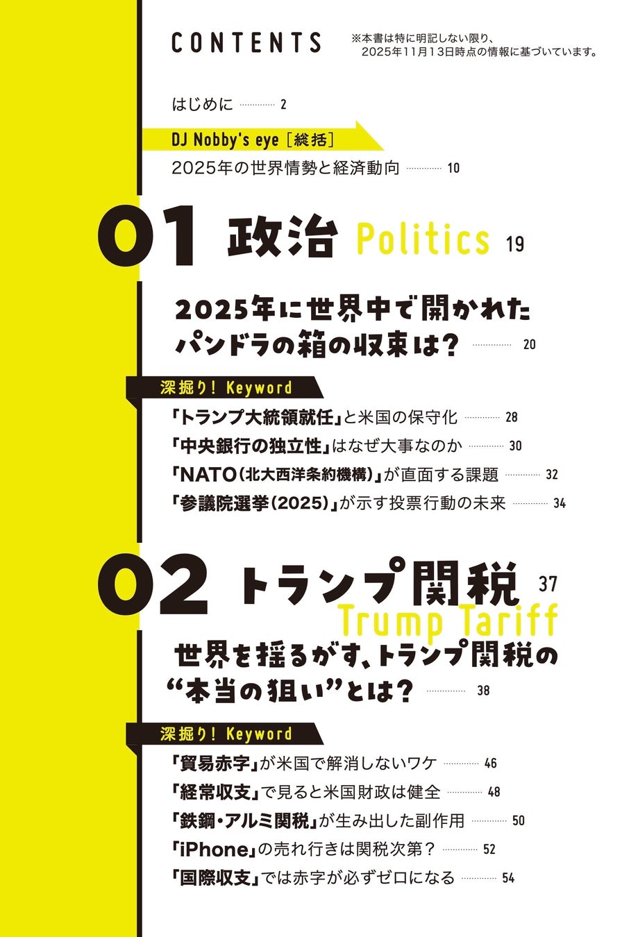 本書では、日本で起きた出来事だけでなく、日本を取り巻く世界情勢までを総ざらいできる構成にしており、トランプ政権の動向と関税政策、物価問題やコメ不足、戦争、投資環境の変化、AI、中国情勢など幅広いテーマを扱います。イラストや図表をふんだんに用いることで、ニュースを“読む”だけでなく“見る”感覚で理解できるエンタメ性の高い一冊です。