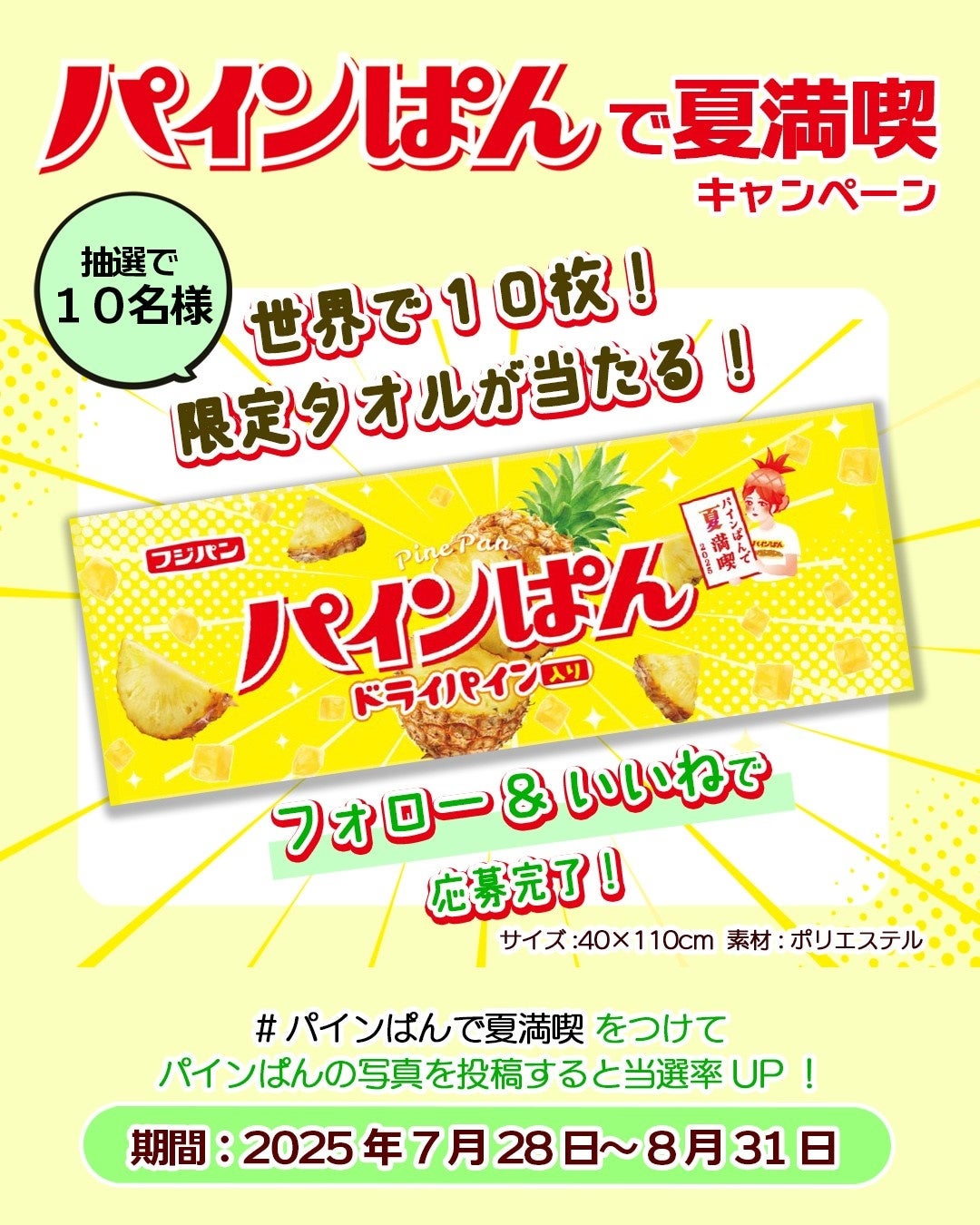 フジパン公式SNSでは、暑い夏をさらに熱く盛り上げる「#パインぱんで夏満喫 キャンペーン」を7月と8月の二か月間に渡り開催します。