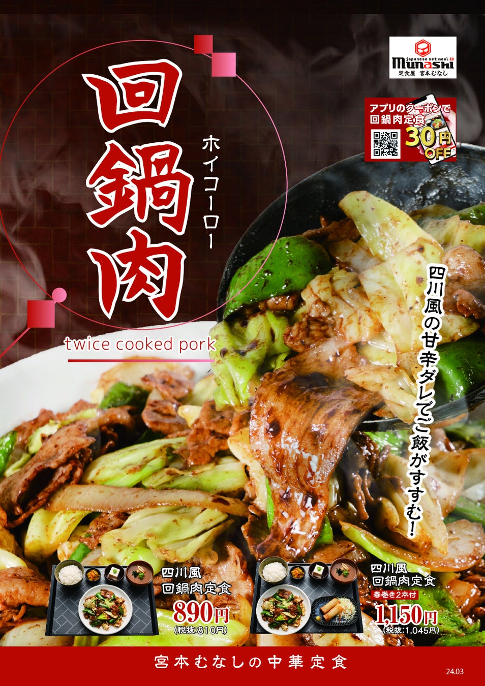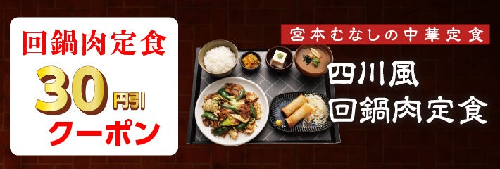 宮本むなし公式アプリでは、販売期間中に何度でも使える「四川風 回鍋肉定食各種30円引き」を配信いたします。会員の方限定でご利用いただけるクーポンですので、この機会にぜひ宮本むなし公式アプリをダウンロード&会員登録ください。