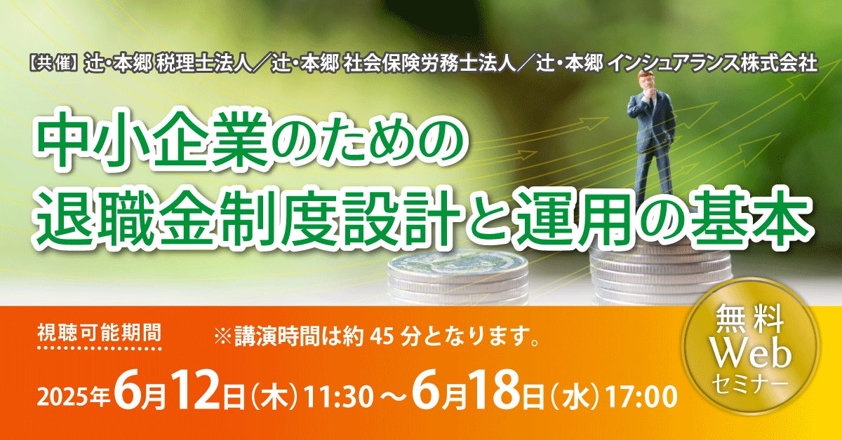 辻・本郷 税理士法人(本社:東京都新宿区、理事長:桑木小恵子)は、辻・本郷 インシュアランス株式会社(本社:東京都新宿区、代表取締役:本郷孔洋)の2社共催で、2025年6月12日(木)より、「中小企業のための退職金制度設計と運用の基本」セミナーを開催いたします。
