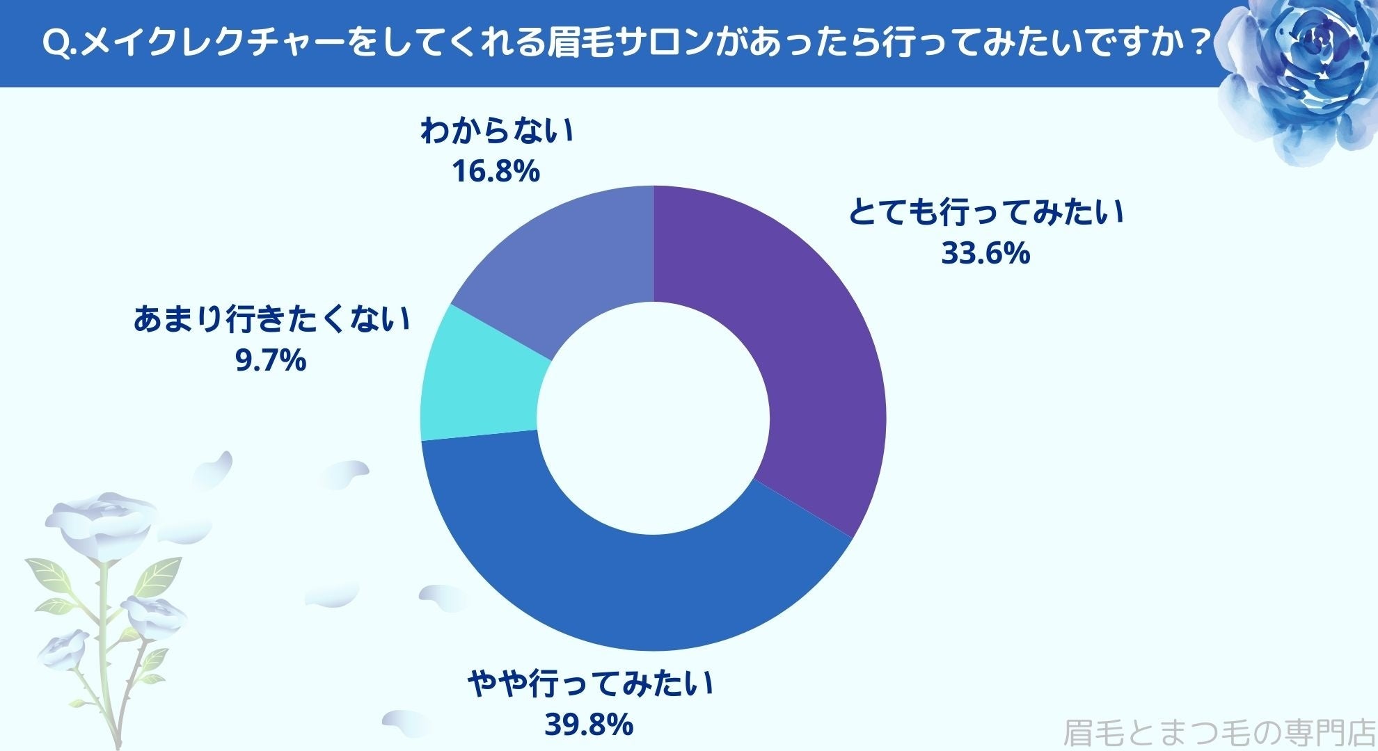 メイクレクチャーをしてくれる眉毛サロンがあったら行ってみたいかお聞きしたところ「とても行ってみたい(33.6%)」、「やや行ってみたい(39.8%)」、「あまり行きたくない(9.7%)」、「わからない(16.8%)」という結果になりました。