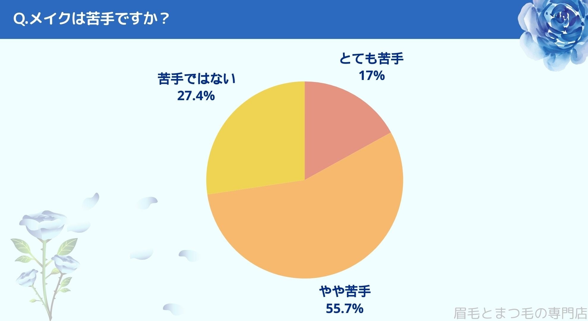 メイクが苦手化お聞きしたところ「とても苦手(17%)」、「やや苦手(55.7%)」、「苦手ではない(27.4%)」という結果になりました。
