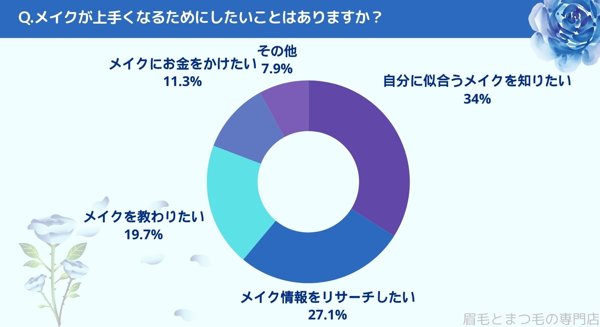 34%)」、「メイク情報をリサーチしたい(27.1%)」、「メイクを教わりたい(19.7%)」、「メイクにお金をかけたい(11.3%)」、「その他(7.9%)」という結果になりました。