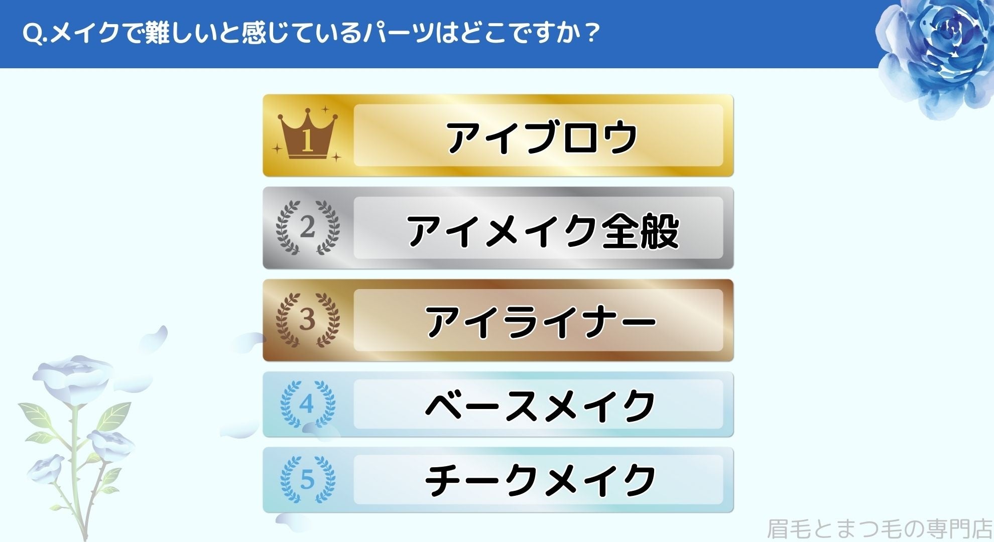 メイクで難しいと感じているパーツをお聞きしたところ「1位>アイブロウ」、「2位>アイメイク全般」、「3位>アイライナー―」、「4位>ベースメイク」、「5位>チークメイク」という結果になりました。