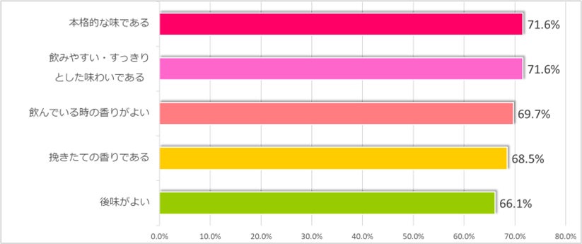 「本格的な味わい」や「すっきりとした飲みやすさ」、「香りのよさ」に関する評価が高く、お客様にコーヒー本来の香りとコクを楽しんでいただけております。