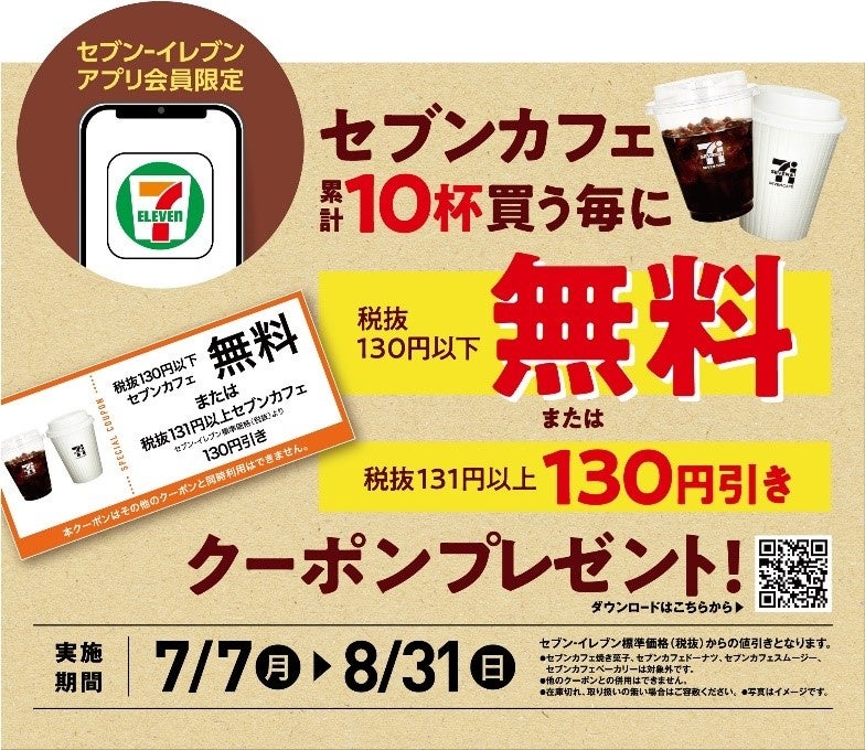 ■期間中にセブンカフェ累計10杯購入する毎に税抜130円以下のセブンカフェ無料クーポン配信