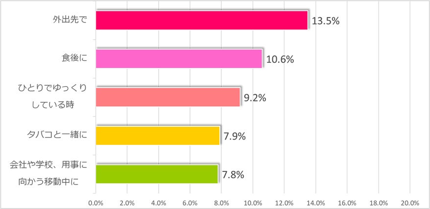 「外出先で」との回答が13.5%と最も多かったものの、回答が分散しており、様々なシーンでお客様にご利用いただけております。