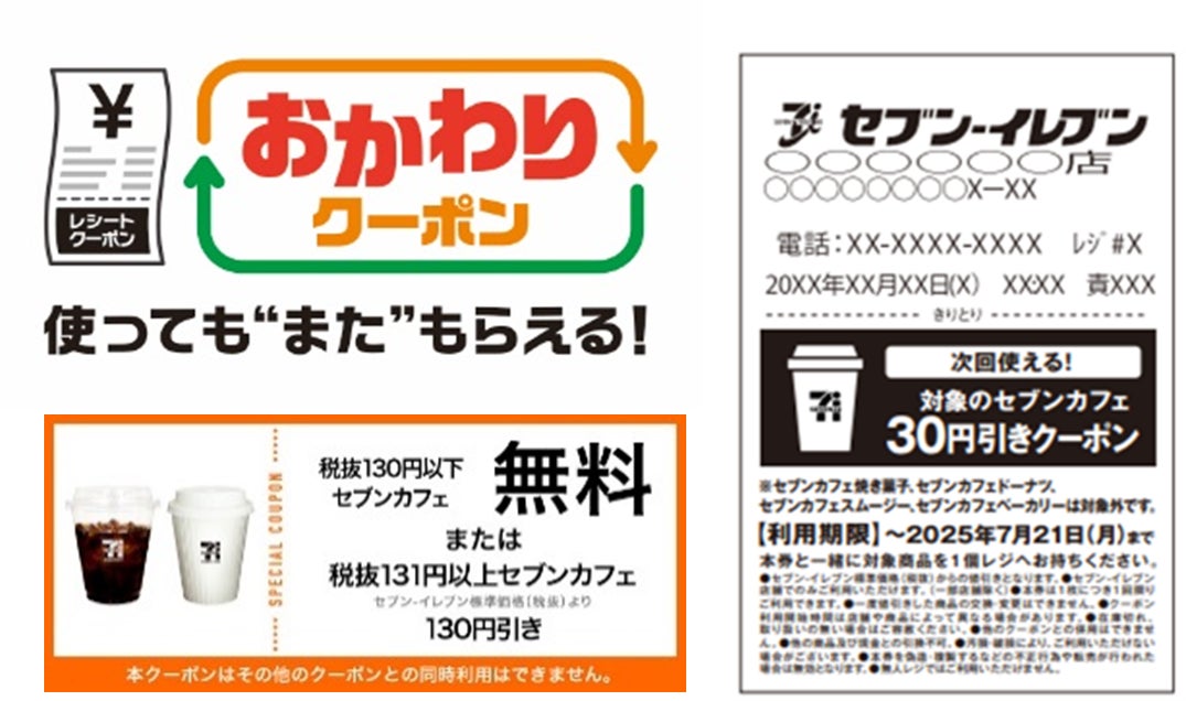 期間中、店舗にてセブンカフェを1杯ご購入いただくと、次回使える割引レシートクーポンをプレゼントいたします。