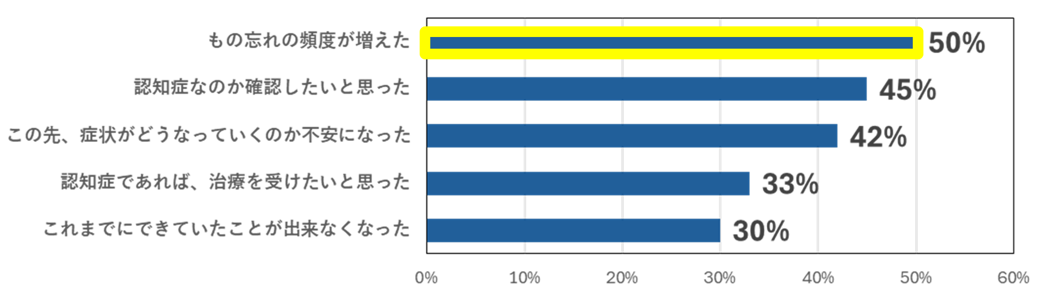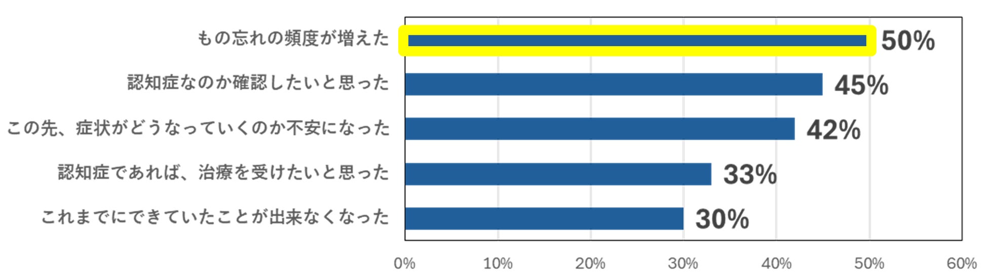 当事者/ご家族に「記憶力(もの忘れ)や思考力(理解・判断力)の変化(低下)」について医療機関を受診したきっかけを質問したところ、「もの忘れの頻度が増えた」が最も多く、50%が回答しました。“もの忘れ”はアルツハイマー病を発見する重要な要素といえます。