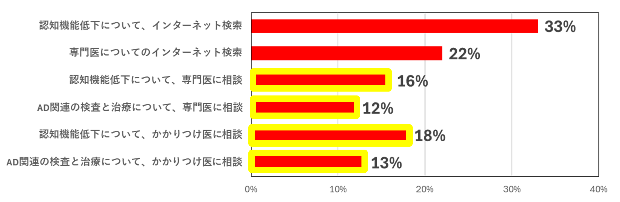 未受診の方/ご家族に「記憶力(もの忘れ)や思考力(理解・判断力)」の問題に関して、過去3か月以内に行った、今後3か月以内に行おうと思うことを質問したところ、「医師に相談」と回答が2割未満でした。 “もの忘れ”の原因がアルツハイマー病かもしれないと認識していても、未受診の方/ご家族は医師への相談に消極的なようです。