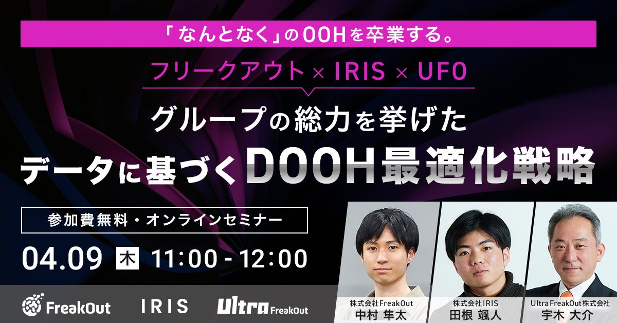 株式会社フリークアウト(本社:東京都港区、代表取締役:時吉 啓司、以下「フリークアウト」)は、グループ会社である株式会社IRIS、およびUltra FreakOut株式会社との3社共同で、2026年4月9日(木)に無料ウェビナー「『なんとなく』のOOHを卒業する。— グループの総力を挙げた、データに基づくDOOH最適化戦略」を開催します。