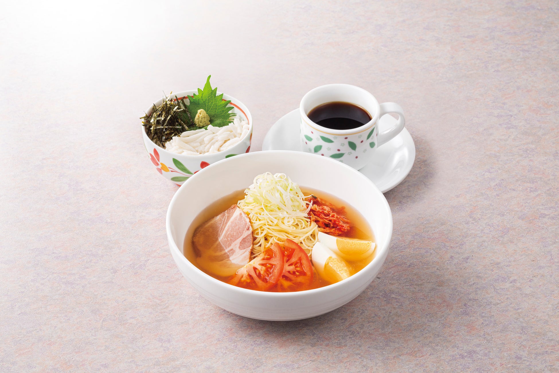 まろやかさの中に力強さを感じる牛骨ベースのスープで味わう冷麺。長芋をのせたミニごはんとのセットです。冷麺には、お好みで別添えのビネガーをかけると一層爽やかな味わいに。食欲が減退しがちな暑い日も、さっぱりとお召し上がりいただけます。
