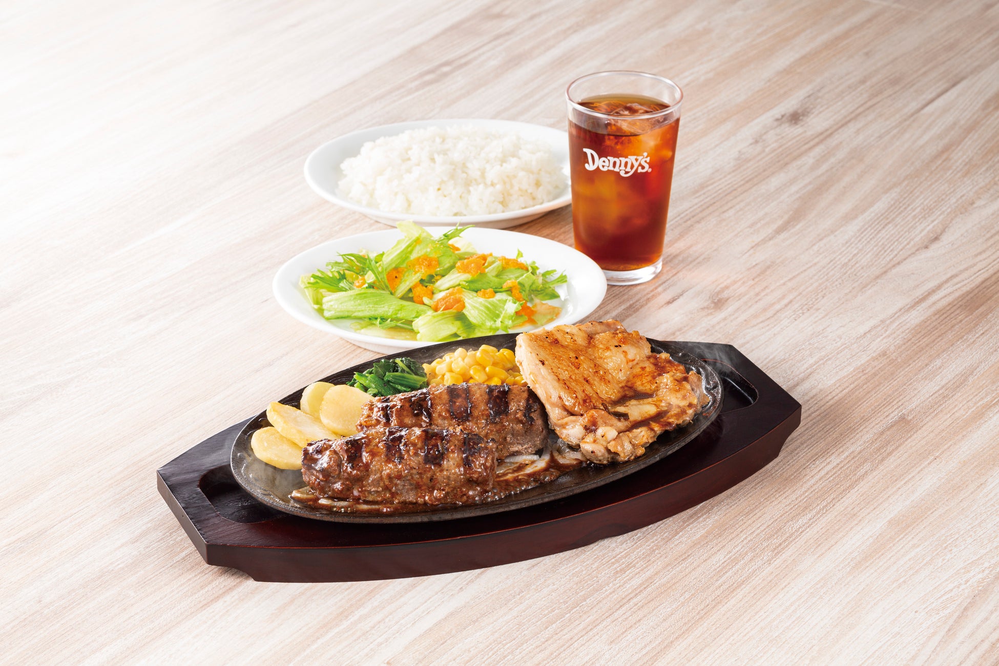 デニーズこだわりのBEEFハンバーグと香ばしく焼き上げたチキンのボリューム満点の組み合わせです。ソースは「おろしソース」「ガーリックソース」「オリエンタルソース」「デミグラスソース」「梅香る和風ソース」からお好みでお選びいただけます。