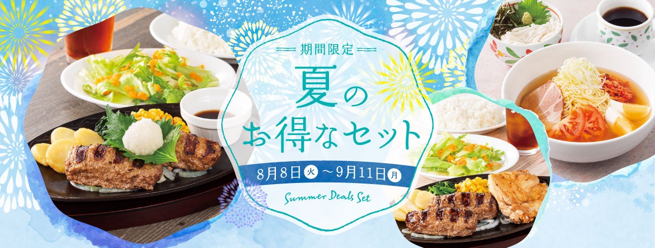 夏のお得なセットでは、「大葉おろしBEEFハンバーグステーキ[約200g]」、「BEEFハンバーグステーキ[約200g]&グリルチキン~選べるソース」に、ライス、サラダ、ドリンクバーがセットとなります。「チャーシューの冷麺風カペリーニとミニとろろごはん」には、ドリンクバーがセットとなります。しっかり食べたい方も、さっぱり食べたい方もそれぞれのシーンに合わせてお楽しみください。