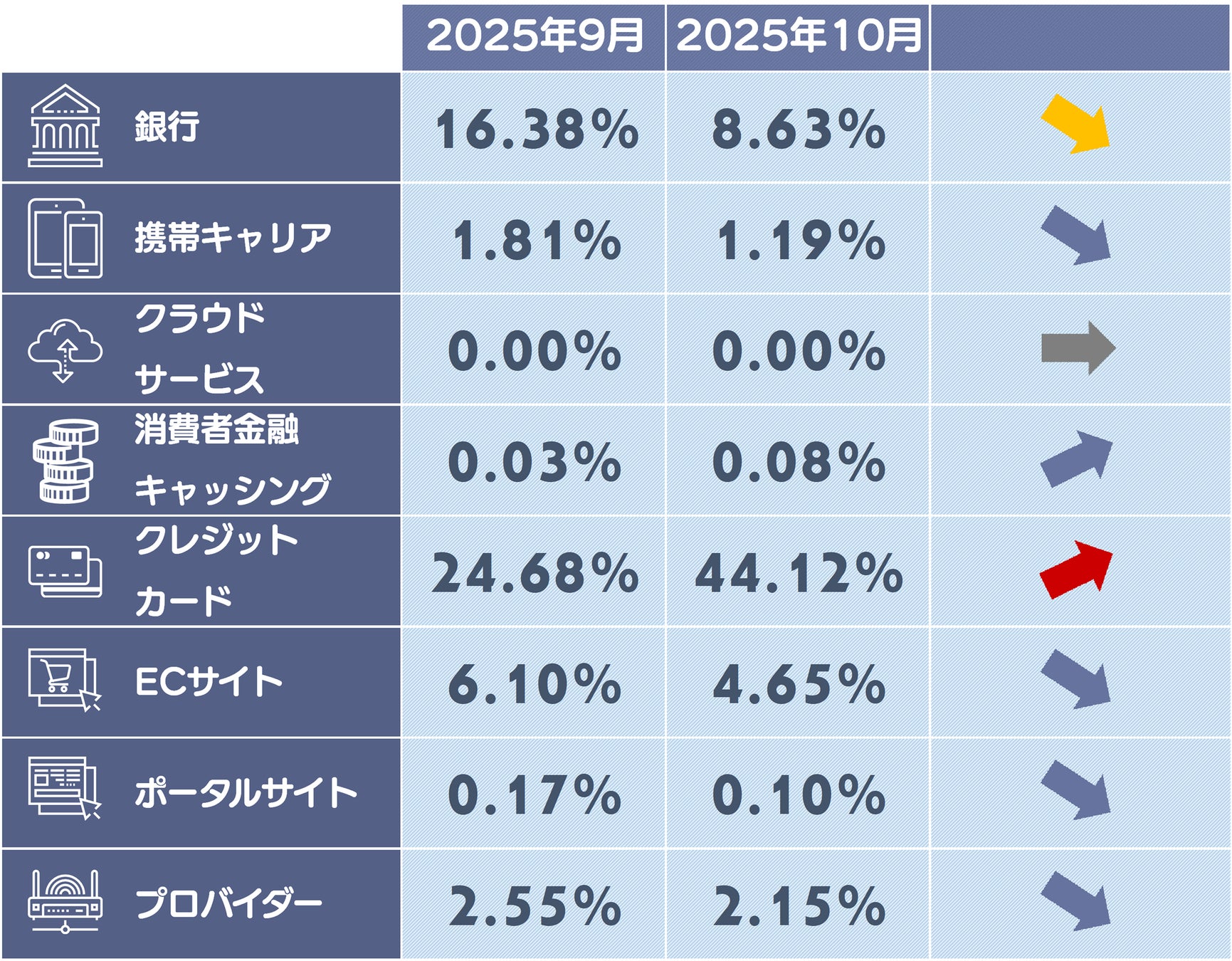 増加し、クレジットカードカテゴリ全体の構成比が20ポイント以上上昇しました。証券系では、これまで観測されてきたSBI証券、大和証券、野村證券、GMOクリック証券に続き、マネックス証券へとターゲットが移行しており、攻撃者によるブランドの「横滑り」戦略が引き続き継続しています。注目すべきは、証券から銀行や信金等の金融系全般に攻撃対象が拡散している点です。